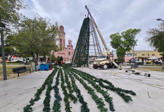 El municipio de Piedras Negras inició la instalación en la macroplaza uno frente a la presidencia municipal, del pino navideño monumental de 20 metros de altura, mientras que los árboles de vialidades y avenidas, isletas y plazas, desde el pasado mes de octubre se empezaron a vestir con luces, informó María Catalina Salinas González, síndico municipal.