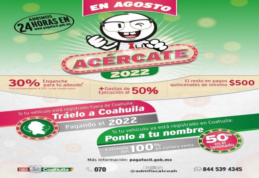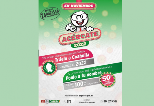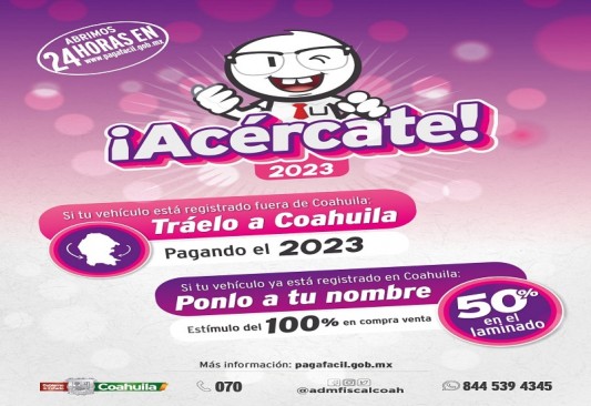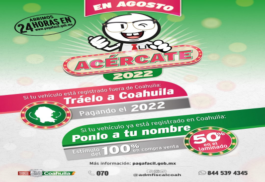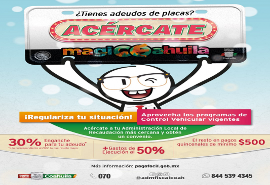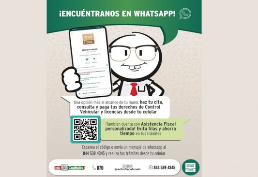 En el caso de requerir asistencia fiscal, puedes llamar al Centro de Atención Telefónica y Trámites marcando al 070, al igual en redes sociales en el Facebook Messenger de Administración Fiscal Coahuila, o también al enviar un whatsapp al 844 539 4345 podrás realizar trámites y recibir asistencia fiscal personalizada.