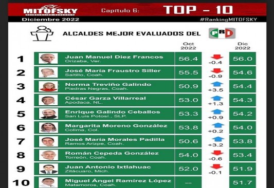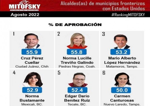 La alcaldesa de Piedras Negras, Norma Treviño Galindo, aparece durante este mes de febrero en el lugar 17 del Top 20 de los Presidentes Municipales mejor evaluados de acuerdo la encuesta realizada por Consulta Mitofsky sobre 150 alcaldes de las principales ciudades del país.