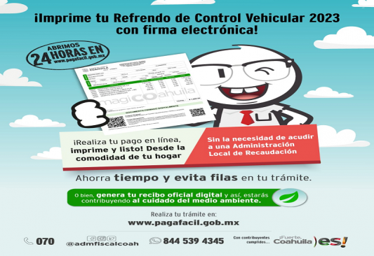 Si requieres asistencia fiscal, llama al Centro de Atención Telefónica y Trámites (CATT) o consulta en redes sociales de @Admfiscalcoah; o bien al enviar un WhatsApp al 844 539 4345 un asesor fiscal responderá tus dudas.